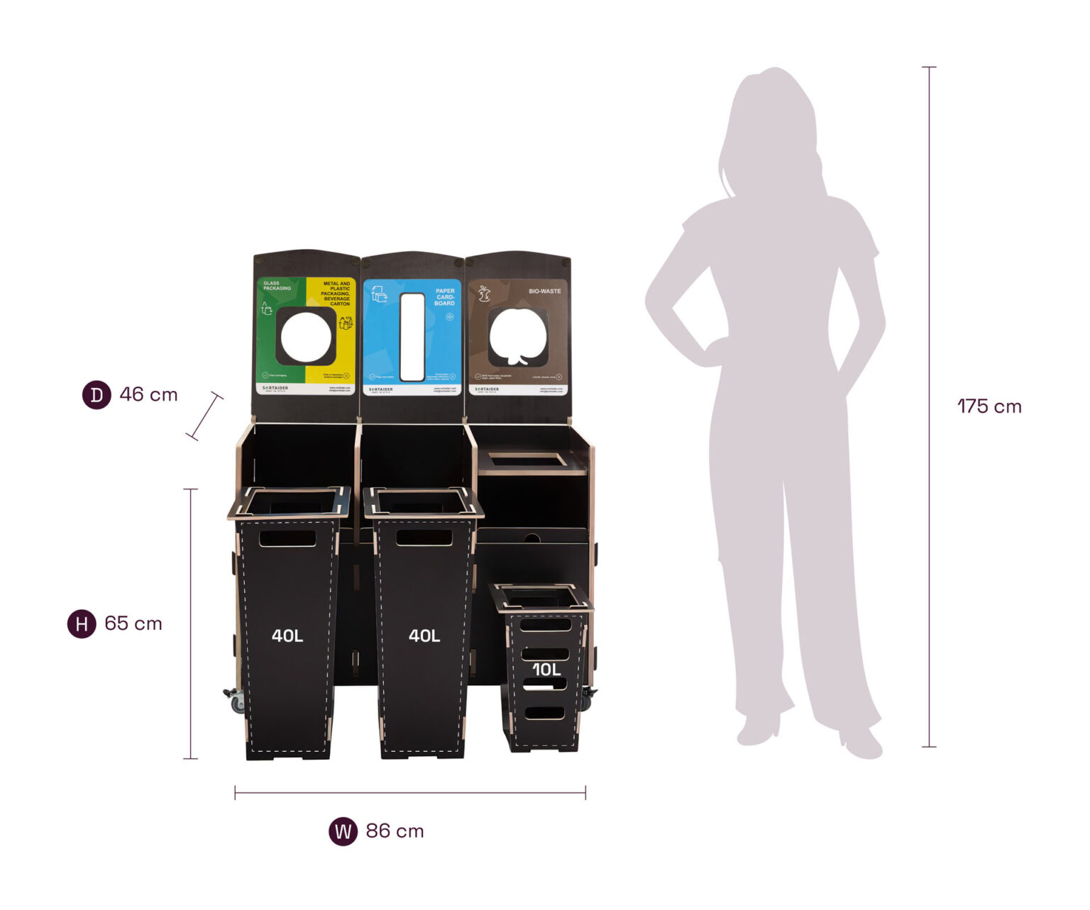 Udstyret med låsbare hjul, tydelige sorteringssymboler og skraldespande af krydsfiner i høj kvalitet forener den praktisk funktionalitet med nordisk inspireret design. Et Sortaider-produkt på 17,5 kg sparer ca. 18,3 kg CO₂, hvilket gør hver skraldespand til et meningsfuldt skridt mod bæredygtighed.