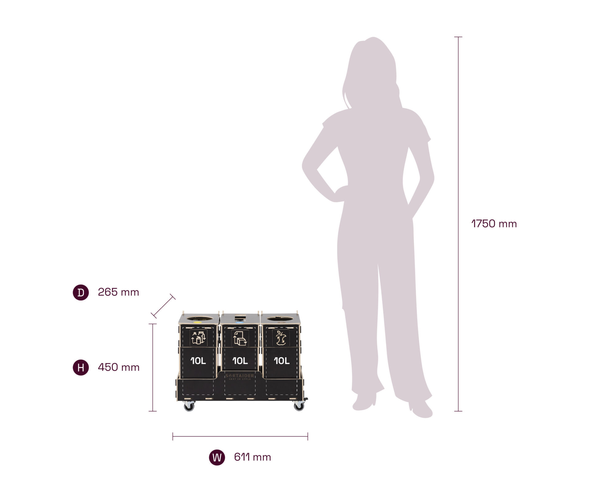 Udstyret med låsbare hjul, tydelige sorteringssymboler og skraldespande af krydsfiner i høj kvalitet forener den praktisk funktionalitet med nordisk inspireret design. Et Sortaider-produkt på 10,4 kg sparer ca. 11,2 kg CO₂, hvilket gør hver skraldespand til et meningsfuldt skridt mod bæredygtighed.
