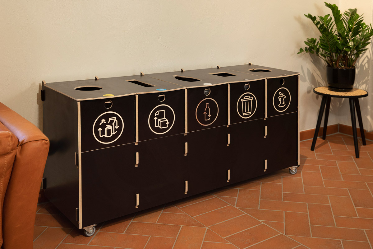 The Recycling Bin Container on elegantti ja kompakti jätteiden lajitteluasema — vuoden 2021 Red Dot -muotoilupalkinnon voittaja. Sen 3–5 erillistä lokeroa tekevät jätteiden lajittelusta vaivatonta ja tehokasta toimistoissa, kouluissa ja julkisissa ympäristöissä.