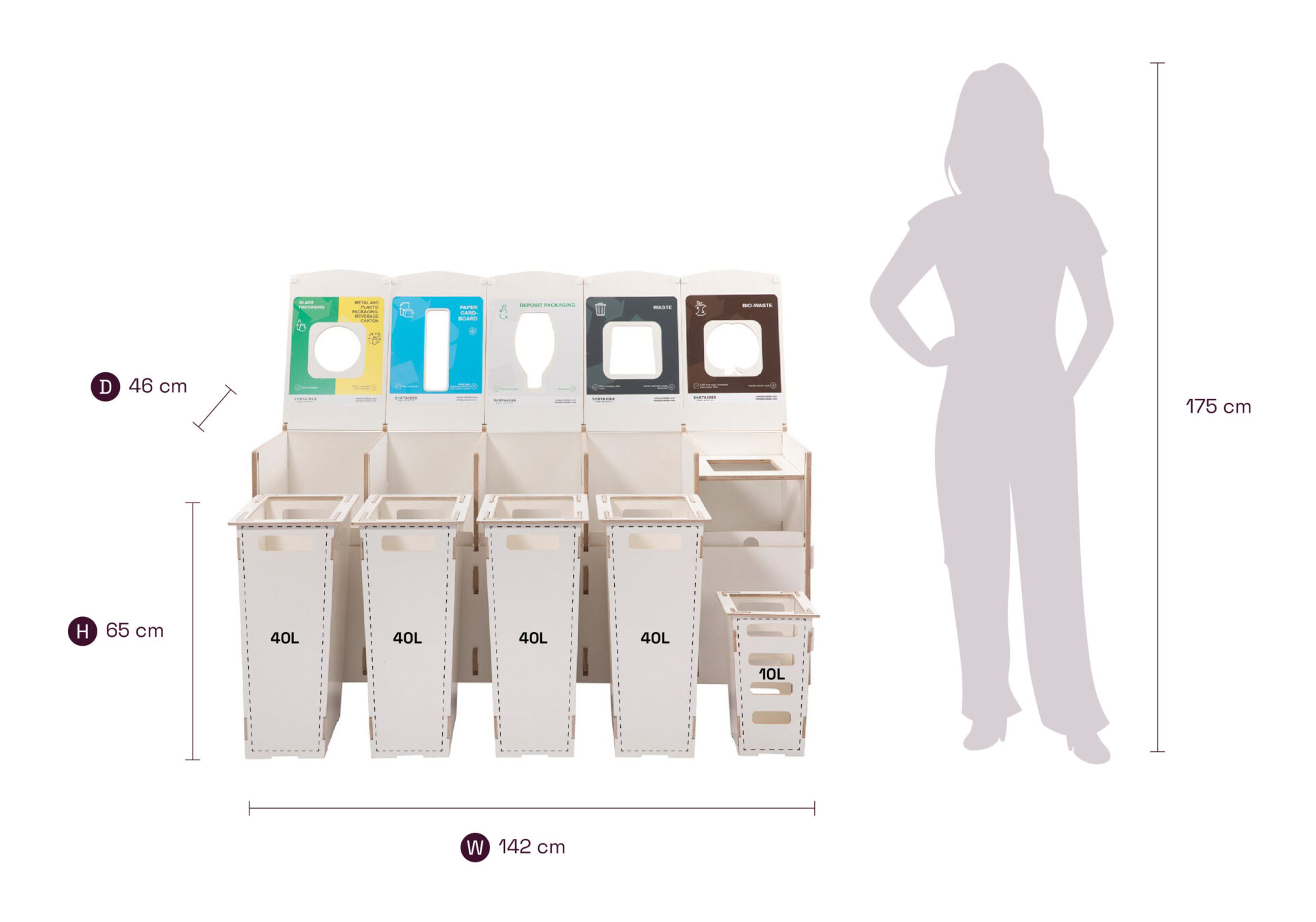 Varje återvinningsbehållare levereras färdigmonterad i en säker, återvinningsbar förpackning – redo att användas direkt ur kartongen. Förpackningen är tillverkad av återvunnet material och säkerställer att produkten levereras säkert med minimal miljöpåverkan.