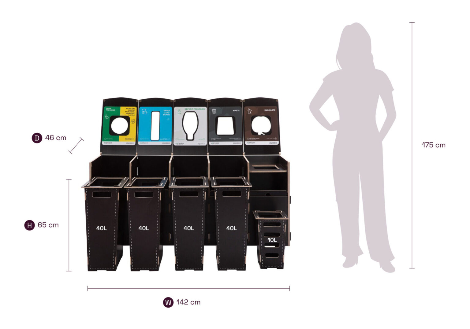 Varje återvinningsbehållare levereras färdigmonterad i en säker, återvinningsbar förpackning – redo att användas direkt ur kartongen. Förpackningen är tillverkad av återvunnet material och säkerställer att produkten levereras säkert med minimal miljöpåverkan.