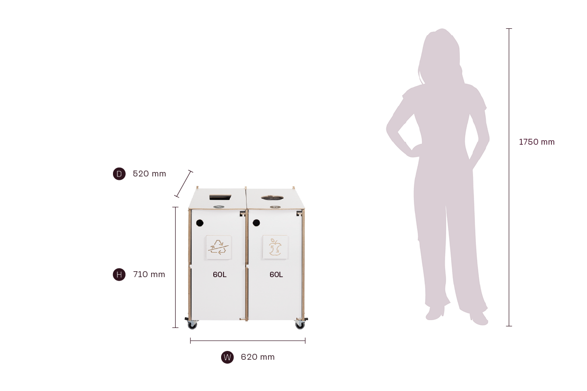 Tydlig visuell vägledning säkerställer korrekt sortering, medan dörrar som öppnas framåt och låsbara hjul gör den dagliga hanteringen och skötseln enkel och effektiv. En idealisk lösning för kontor, skolor och offentliga miljöer som värdesätter design, anpassningsförmåga och hållbarhet.