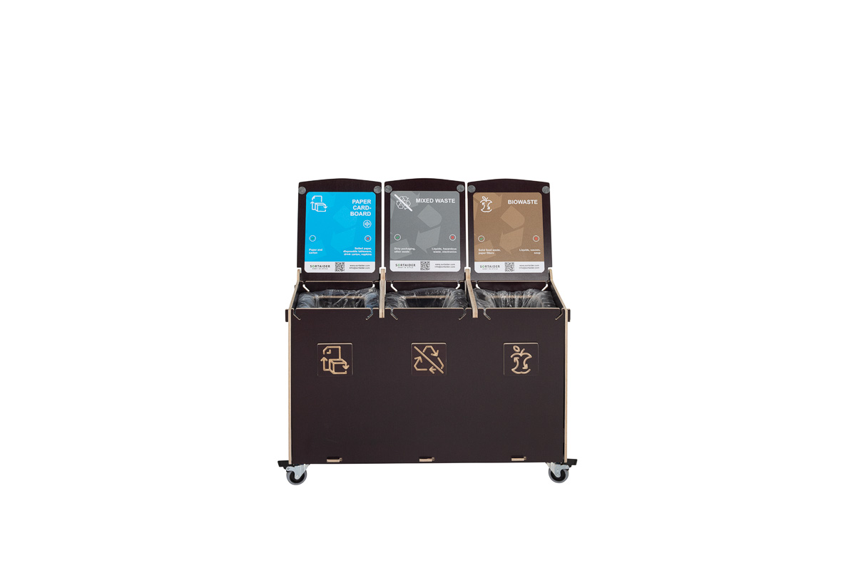 Sorta är byggd för hållbarhet och funktionalitet och har fack av högkvalitativ plywood, låsbara svängbara hjul och flerspråkiga, färgkodade sorteringssymboler som underlättar korrekt avfallshantering. Den robusta konstruktionen är lämplig för miljöer med hög trafik, medan det verktygsfria systemet för byte av påsar säkerställer snabbt underhåll och hygienisk användning.