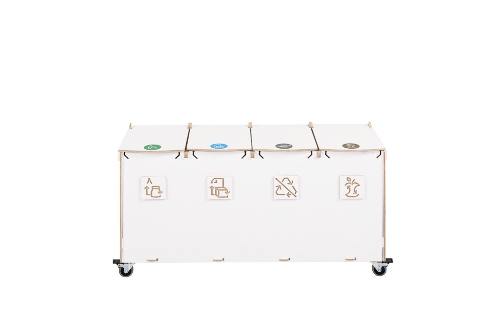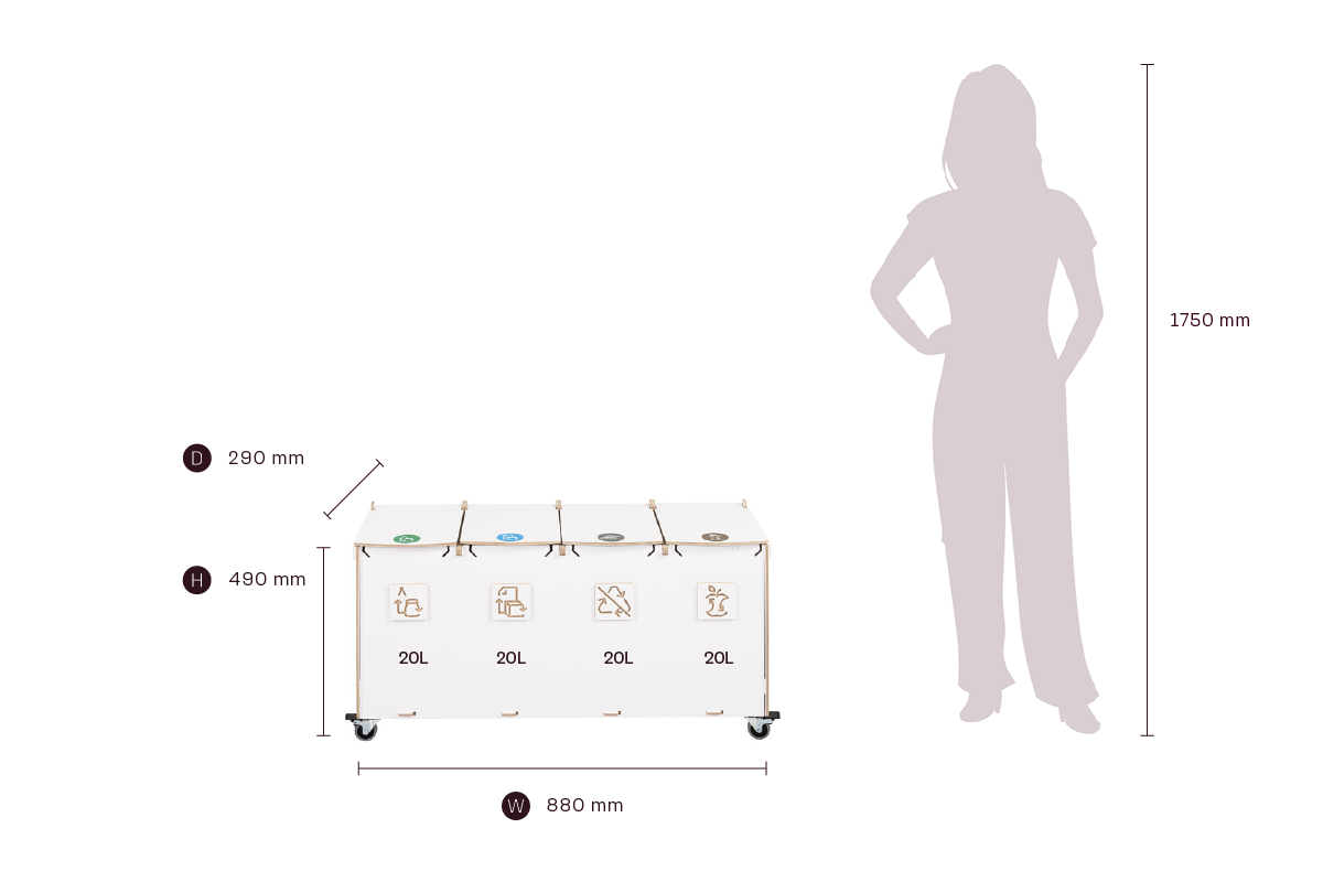 Sorta är byggd för hållbarhet och funktionalitet och har fack av högkvalitativ plywood, låsbara svängbara hjul och flerspråkiga, färgkodade sorteringssymboler som underlättar korrekt avfallshantering. Den robusta konstruktionen är lämplig för miljöer med hög trafik, medan det verktygsfria systemet för byte av påsar säkerställer snabbt underhåll och hygienisk användning.
