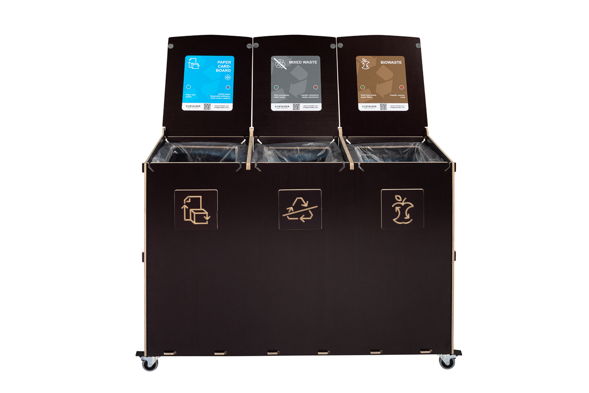 Sorta är byggd för hållbarhet och funktionalitet och har fack av högkvalitativ plywood, låsbara svängbara hjul och flerspråkiga, färgkodade sorteringssymboler som underlättar korrekt avfallshantering. Den robusta konstruktionen är lämplig för miljöer med hög trafik, medan det verktygsfria systemet för byte av påsar säkerställer snabbt underhåll och hygienisk användning.