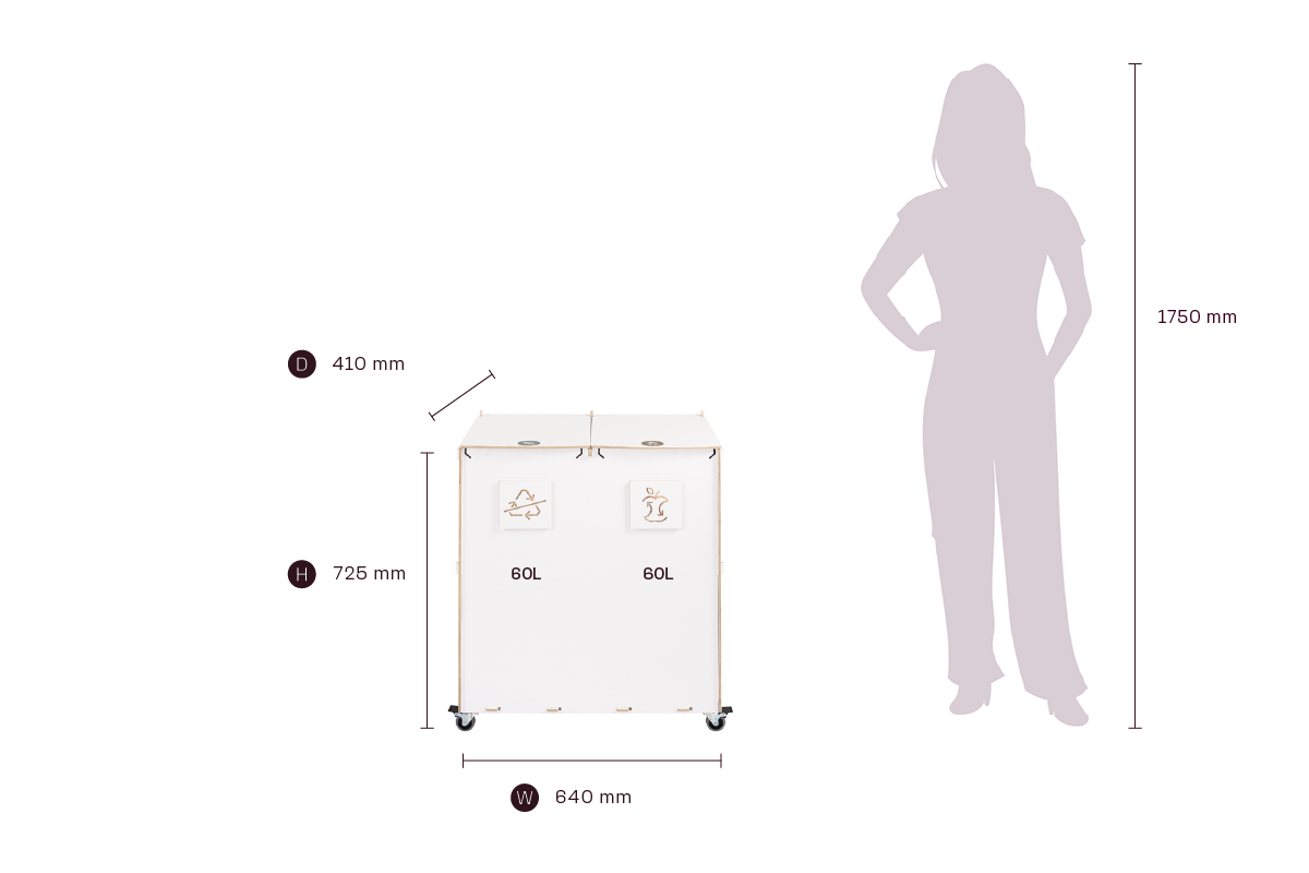 Sorta är byggd för hållbarhet och funktionalitet och har fack av högkvalitativ plywood, låsbara svängbara hjul och flerspråkiga, färgkodade sorteringssymboler som underlättar korrekt avfallshantering. Den robusta konstruktionen är lämplig för miljöer med hög trafik, medan det verktygsfria systemet för byte av påsar säkerställer snabbt underhåll och hygienisk användning.