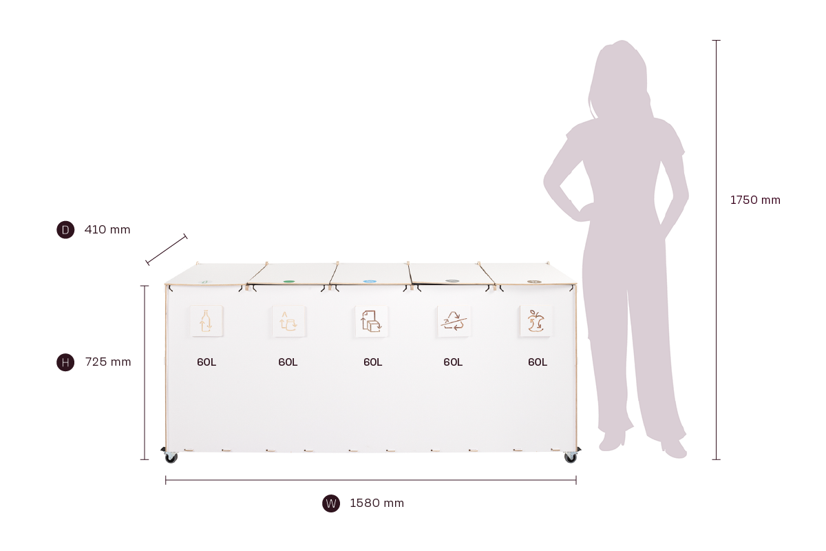 Med sin kompakta storlek och effektiva kapacitet kombinerar Sorta hållbara plywoodmaterial med funktionell design, vilket gör den till en pålitlig lösning för organiserad och ansvarsfull avfallshantering i professionella miljöer.