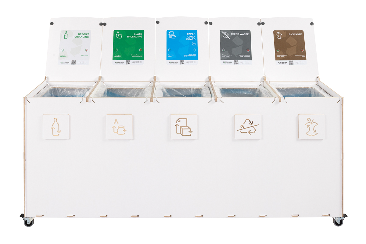 Sorta är byggd för hållbarhet och funktionalitet och har fack av högkvalitativ plywood, låsbara svängbara hjul och flerspråkiga, färgkodade sorteringssymboler som underlättar korrekt avfallshantering. Den robusta konstruktionen är lämplig för miljöer med hög trafik, medan det verktygsfria systemet för byte av påsar säkerställer snabbt underhåll och hygienisk användning.