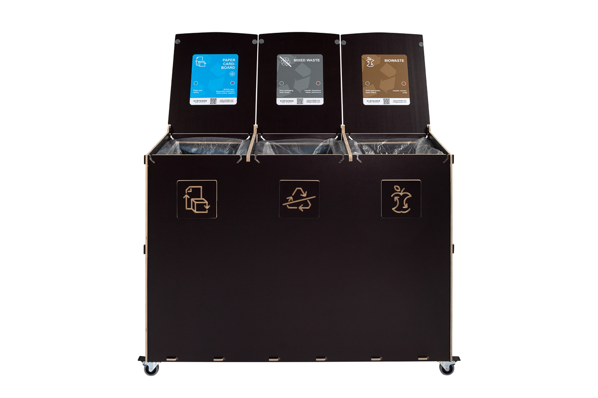 Sorta är byggd för hållbarhet och funktionalitet och har fack av högkvalitativ plywood, låsbara svängbara hjul och flerspråkiga, färgkodade sorteringssymboler som underlättar korrekt avfallshantering. Den robusta konstruktionen är lämplig för miljöer med hög trafik, medan det verktygsfria systemet för byte av påsar säkerställer snabbt underhåll och hygienisk användning.