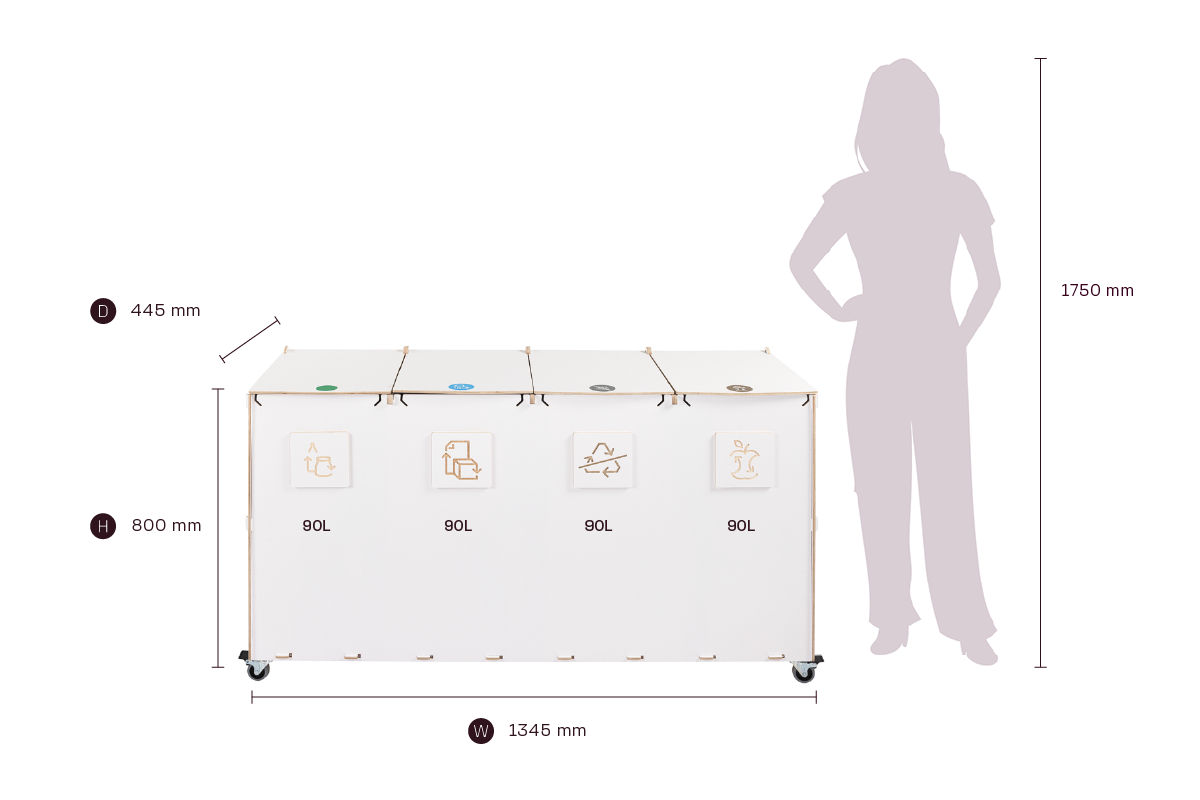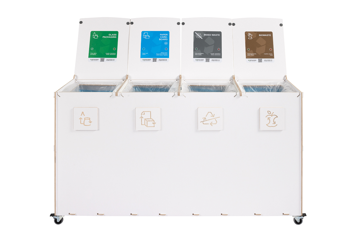Sorta är byggd för hållbarhet och funktionalitet och har fack av högkvalitativ plywood, låsbara svängbara hjul och flerspråkiga, färgkodade sorteringssymboler som underlättar korrekt avfallshantering. Den robusta konstruktionen är lämplig för miljöer med hög trafik, medan det verktygsfria systemet för byte av påsar säkerställer snabbt underhåll och hygienisk användning.