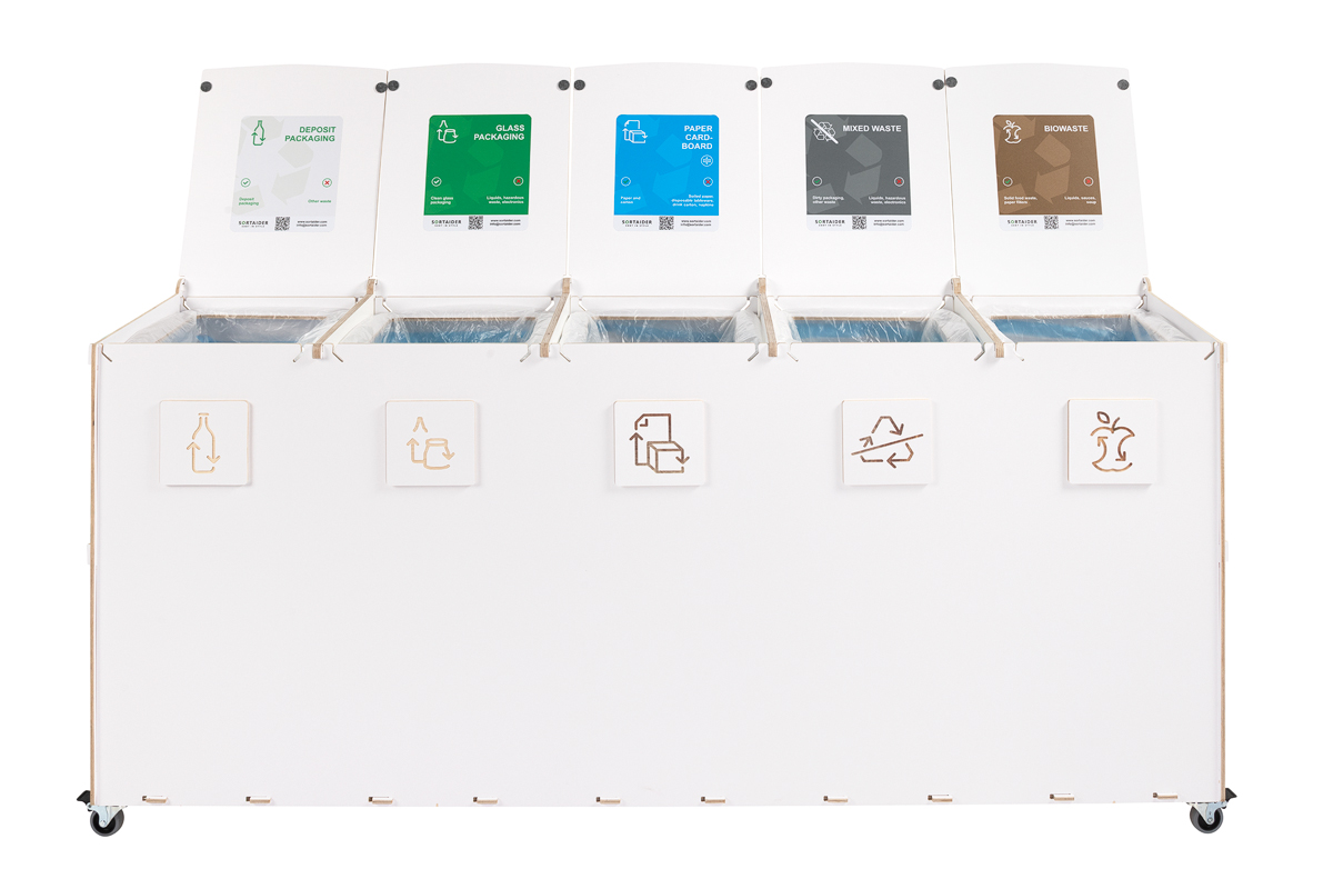 Sorta är byggd för hållbarhet och funktionalitet och har fack av högkvalitativ plywood, låsbara svängbara hjul och flerspråkiga, färgkodade sorteringssymboler som underlättar korrekt avfallshantering. Den robusta konstruktionen är lämplig för miljöer med hög trafik, medan det verktygsfria systemet för byte av påsar säkerställer snabbt underhåll och hygienisk användning.