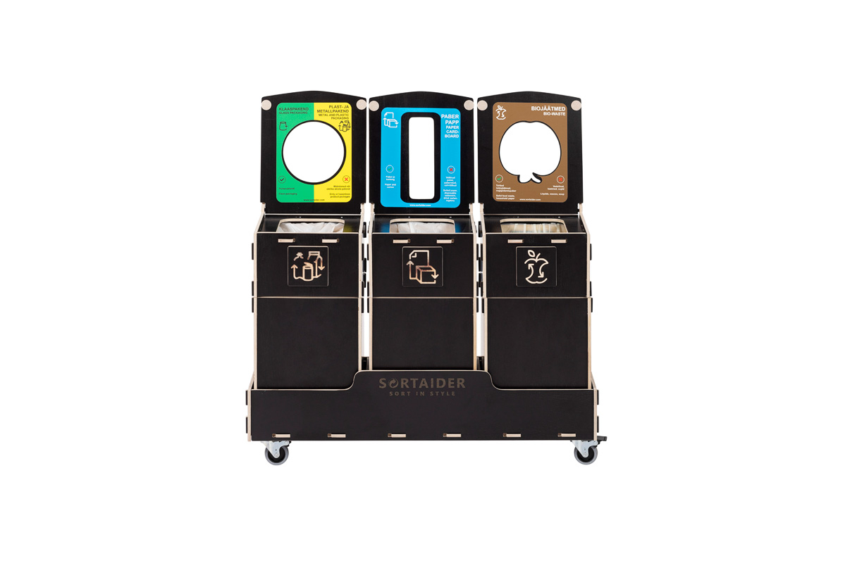 Sortaider är en elegant och kompakt avfallssorteringsstation. Med 1–5 separata fack gör den avfallssorteringen smidig och effektiv på kontor, i skolor och i offentliga miljöer.