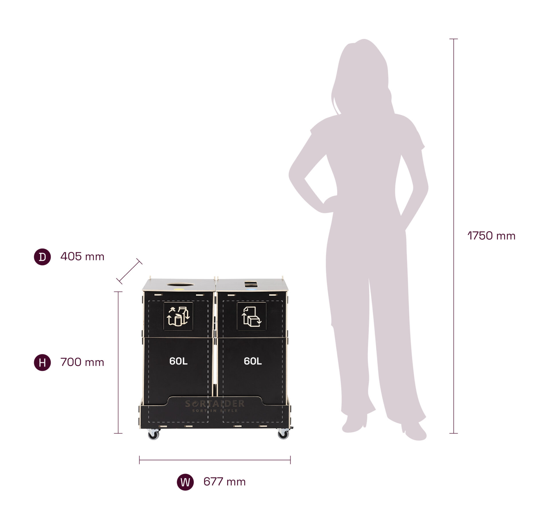 Utrustad med låsbara hjul, tydliga sorteringssymboler och behållare av högkvalitativ plywood förenar den praktisk funktion med nordiskt inspirerad design. En Sortaider-produkt på 17,6 kg sparar cirka 18,4 kg CO₂, vilket gör varje behållare till ett betydelsefullt steg mot hållbarhet.
