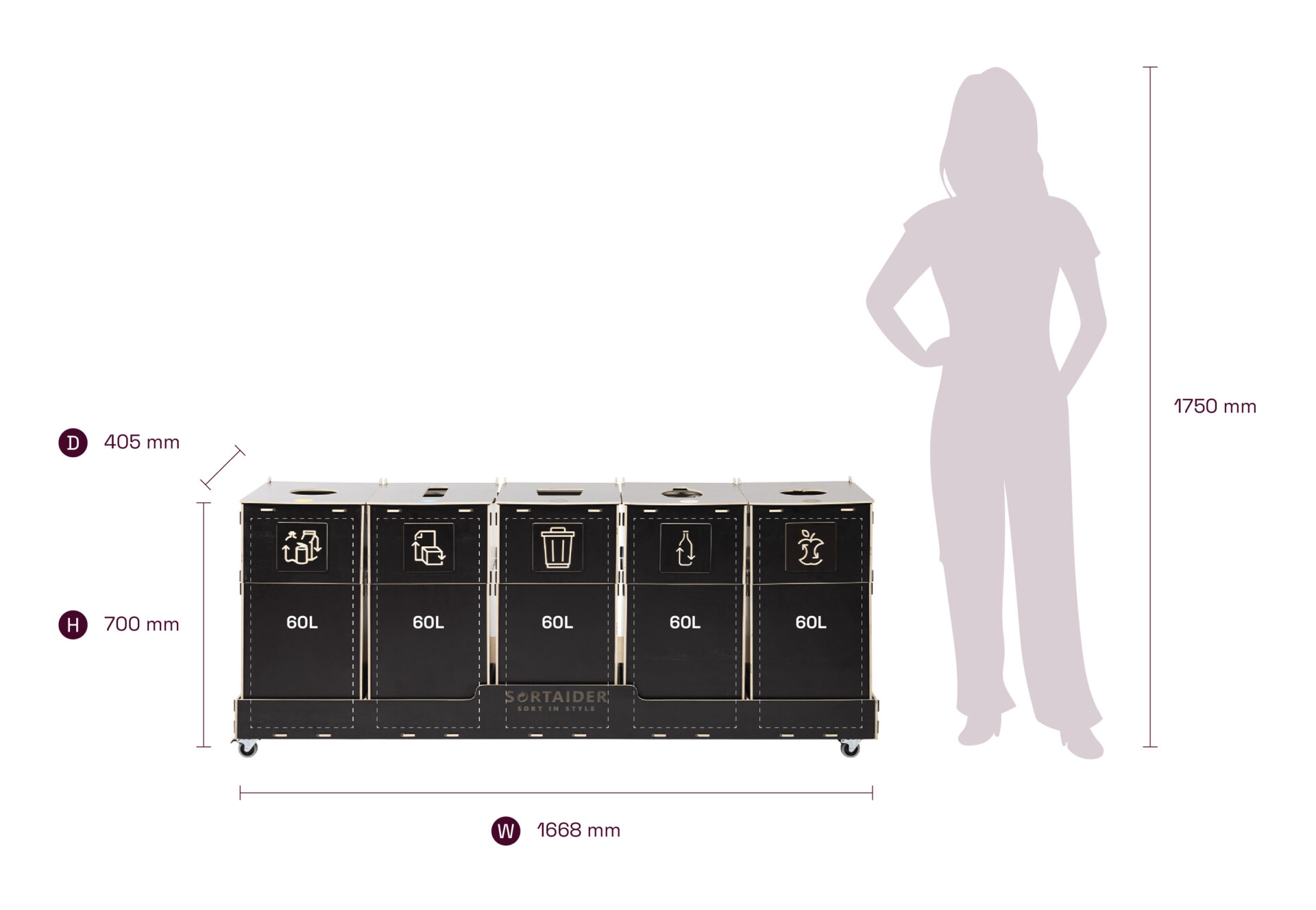 Utrustad med låsbara hjul, tydliga sorteringssymboler och behållare av högkvalitativ plywood förenar den praktisk funktionalitet med nordiskt inspirerad design. En Sortaider-produkt på 43,8 kg sparar cirka 44,6 kg CO₂, vilket gör varje behållare till ett betydelsefullt steg mot hållbarhet.