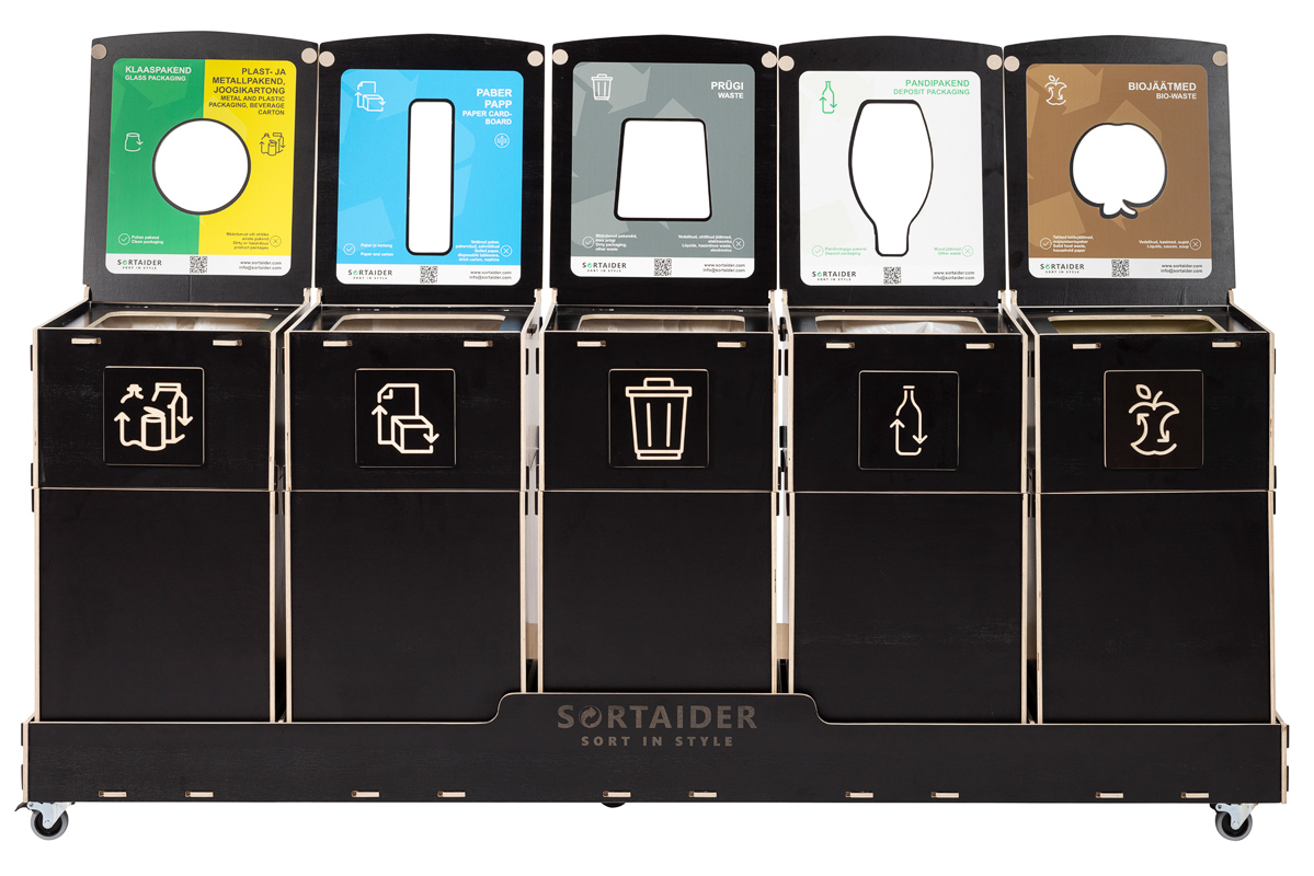 Sortaider är en elegant och kompakt avfallssorteringsstation. Med 1–5 separata fack gör den avfallssorteringen smidig och effektiv på kontor, i skolor och i offentliga miljöer.