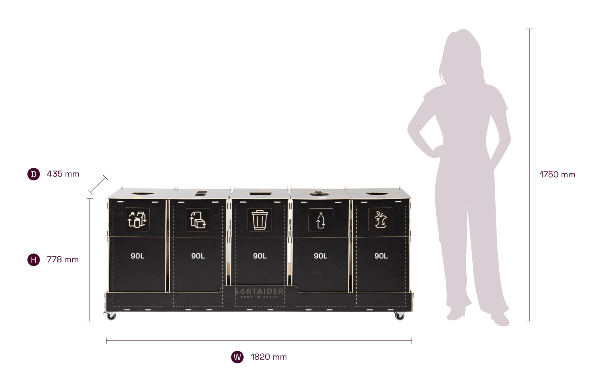 Utrustad med låsbara hjul, tydliga sorteringssymboler och behållare av högkvalitativ plywood förenar den praktisk funktion med nordiskt inspirerad design. En Sortaider-produkt på 47,8 kg sparar cirka 48,6 kg koldioxid, vilket gör varje behållare till ett meningsfullt steg mot hållbarhet.